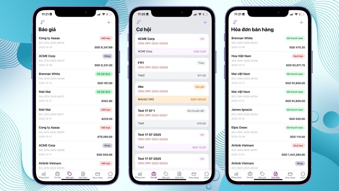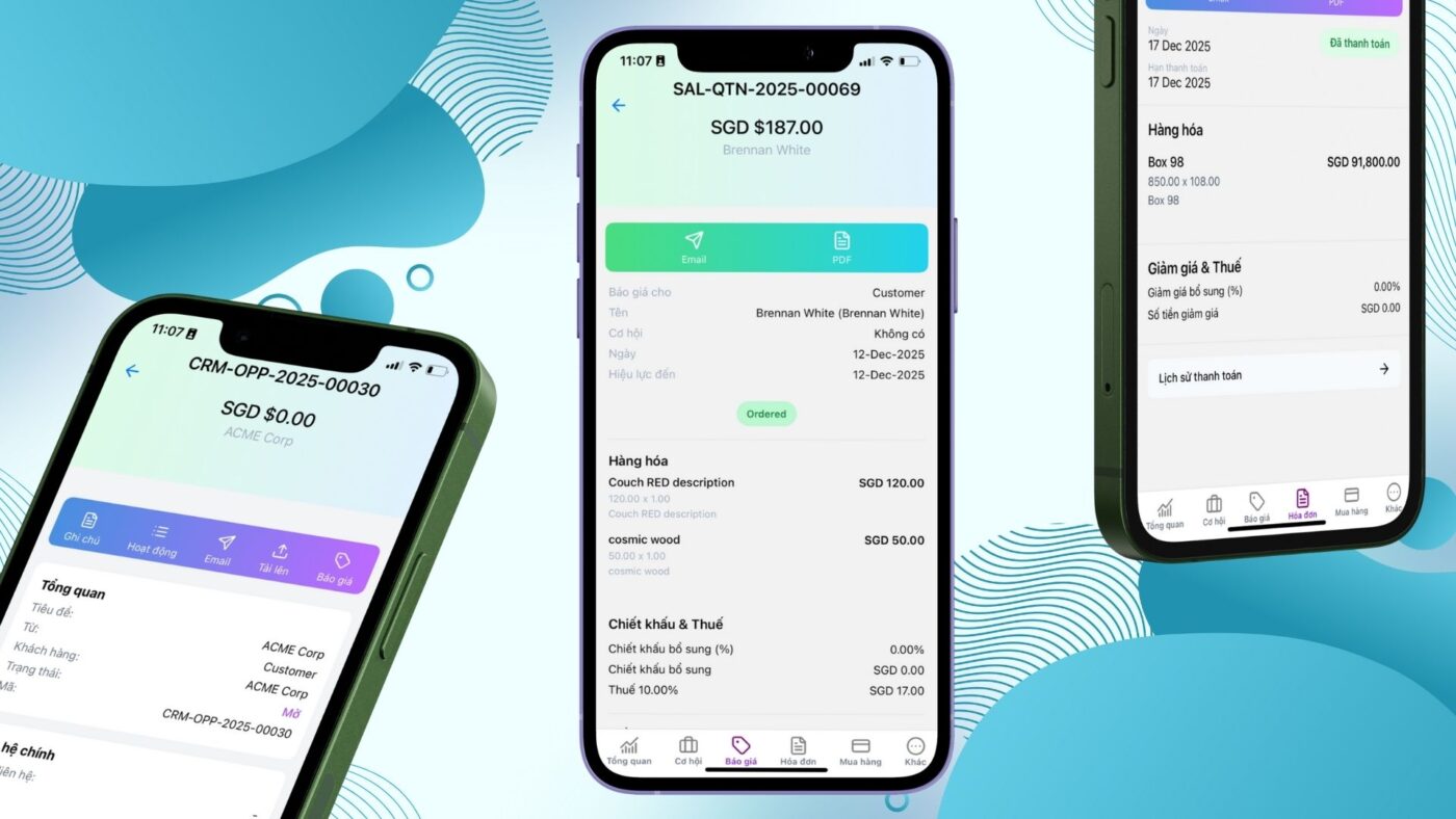 • Báo giá & Đơn hàng (Sales): Lập báo giá chuyên nghiệp, tự động tính thuế VAT, chiết khấu và xuất file PDF/Gửi Email trực tiếp cho khách hàng từ ứng dụng.
